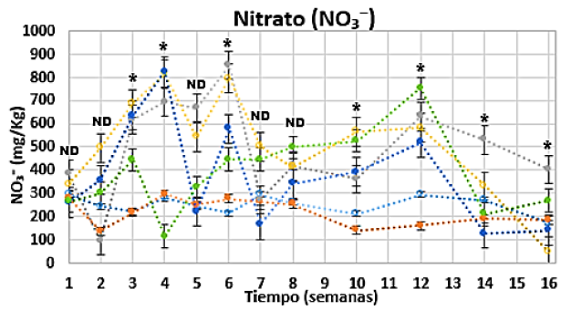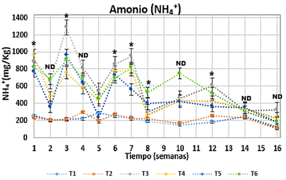 Para el (Figura 2), esta forma de nitrógeno se encuentra fácilmente disponible principalmente entre las semanas 3, 6 y 12 [7]. El tratamiento que mayor