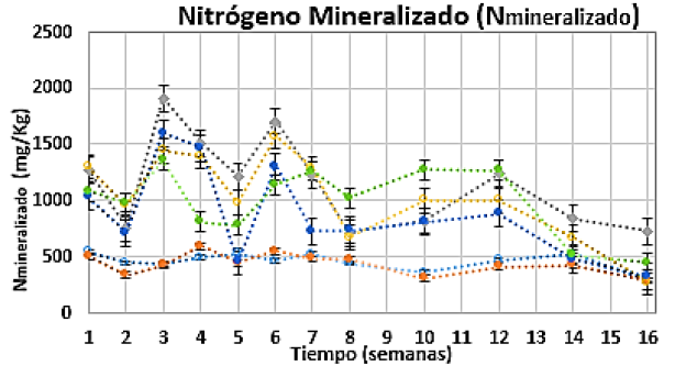Con relación al Nmineralizado (Figura 3), en las primeras 8 semanas se observó una mayor mineralización del N en todos los tratamientos, evidenciado por los picos más altos de las curvas [11], [36] de la semana 8 a la semana 12, la mineralización se comportó de forma más estable, mientras que a partir de la semana 12 se presentó un descenso, comportamiento que es similar a otros estudios con otro tipo de enmiendas orgánicas como el lombricompost y la gallinaza [36].