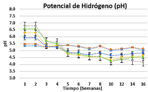 La Figura 4 muestra el comportamiento del pH, el cual se incrementó en todos los tratamientos conformados con urea durante las dos primeras semanas T3 (100% urea), T4 (suelo + 50% EO + 50% urea), T5 (suelo + 75% EO + 25% urea) y T6 (suelo + 25% EO+ 75% urea), lo que se debe a que la concentración del N de este fertilizante (46 %) al ser aplicado al suelo, produce la hidratación del gránulo y su disolución y la ureasa bacteriana, enzima presente en los suelos, produce el desdoblamiento de la molécula en CO3NH4 (carbonato de amonio) y CO (monóxido de carbono) que es inestable, ocasionando hidrólisis de forma instantánea, generando un aumento del pH debido a la producción de amoniaco [40]; sin embargo, a partir de la semana 3 se evidenció una disminución del pH debido a la acción acidificante del fertilizante [41]- [43].