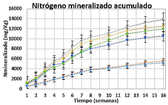 , cuya sumatoria corresponde a la forma de N disponible para la planta [21], el cual se midió semanalmente durante las primeras 12 semanas de muestreo y luego cada 15 días, hasta la semana 16 [36]. Los datos fueron usados para construir las curvas de mineralización a partir del valor promedio de las tres réplicas de cada tratamiento.
