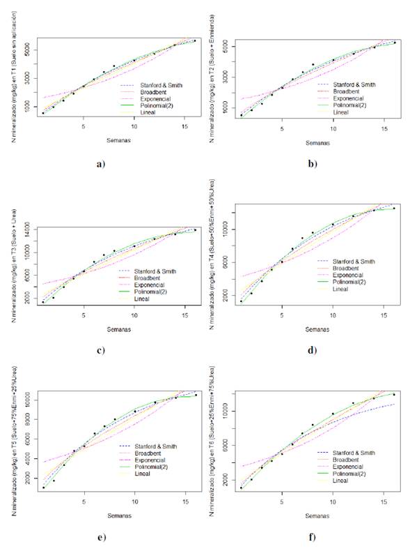 En la Figura 6 se observa el ajuste de los modelos matemáticos que describen el proceso de la mineralización del N para cada tratamiento y en las Tablas V a X se muestran los resultados de la modelación de la mineralización en cada tratamiento, con sus respectivos parámetros y errores.
