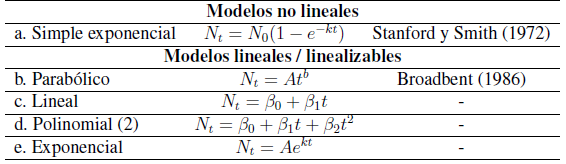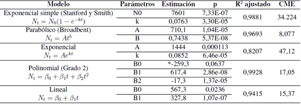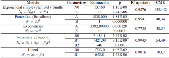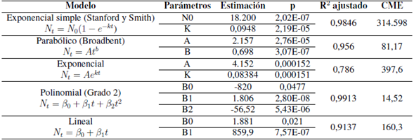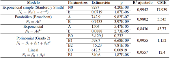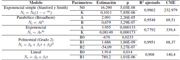 A partir de los datos experimentales y las curvas de mineralización, se evaluaron los modelos mostrados en la Tabla I. El ajuste de los parámetros correspondientes a cada modelo se realizó implementando el algoritmo de Newton Raphsson en la plataforma de R (R-3.4.2). Para la selección del mejor ajuste de cada modelo, se consideraron métricas como el coeficiente de determinación ajustado (R2) y el cuadrado medio de error (CME), considerando que el mejor ajuste es aquel que maximiza el R2 y simultáneamente minimiza el CME[22].
