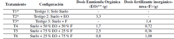 La unidad experimental (UE) para los ensayos de mineralización correspondió a bolsas de polietileno con dimensiones de 40 cm x 50 cm y capacidad de 2 kg. Cada UE se preparó con 1 kg de suelo, el cual fue tamizado a 2 mm, homogeneizado y cuarteado [29]. Para la conformación de los tratamientos a evaluar, se utilizó un diseño unifactorial completamente al azar, evaluando como factor la influencia de la proporción de mezcla enmienda orgánica: fertilizante inorgánico-urea (EO: F) con tres niveles de estudio definidos, calculando las dosis en gramos a través de un balance de masa y partiendo de una dosis de 200 kg/ha de N para cada tratamiento [30]. Adicionalmente se contó con tres tratamientos control (testigos) como se muestra en la Tabla III, para un total de seis tratamientos, los cuales se evaluaron por triplicado.
