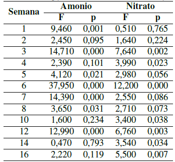 Esto pudo deberse a que la urea se hidrolizó con rapidez por efecto de la enzima “ureasa” [39]. De la semana 14 a la 16, todos los tratamientos presentaron una disminución en el aporte de , debido a que se están mineralizando los materiales más resistentes y que necesitan más tiempo para la descomposición por parte de los microorganismos [7]. La prueba ANOVA para el
