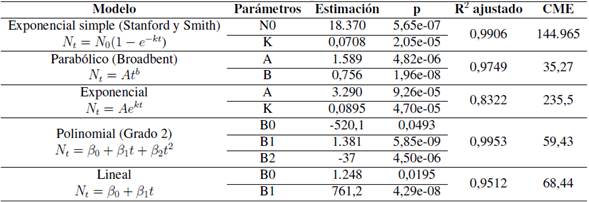 Para este caso, el modelo parabólico de Broadbent y el lineal, que presentaron los mejores ajustes, con valores del coeficiente de determinación (R2) mayores al 80 %; sin embargo, es recomendable en cada caso, evaluar diferentes modelos para identificar el que mejor represente este mecanismo.