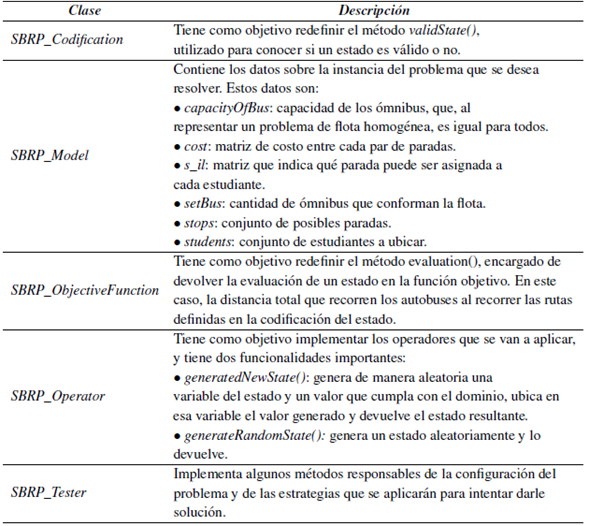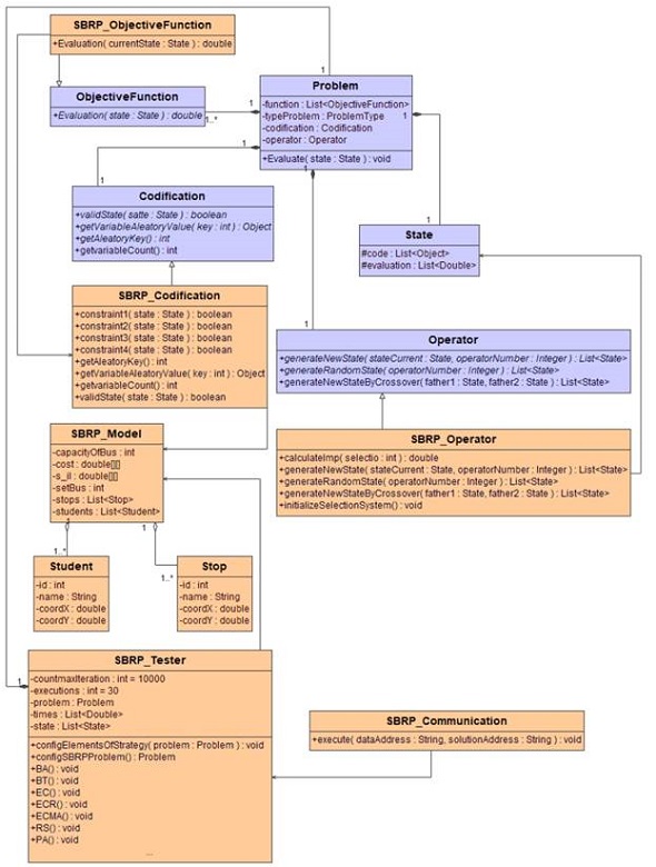 En la Figura 1 se ilustra el diagrama que refleja las clases definidas para la implementación del problema SBRP que hace uso de la biblioteca BiCIAM.