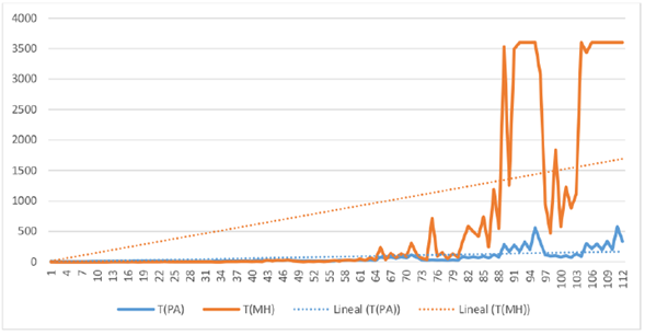 Por otra parte, el tiempo promedio de diferencia cuando MH es más rápido que PA es de aproximadamente 8 segundos, mientras que el promedio de la diferencia cuando PA es más rápido que MH es de aproximadamente 1,180 segundos (20 minutos). Esto implica que, a mayor complejidad del problema, la solución propuesta logra ahorrar más, llegando a ser diez veces más rápida en varias de estas instancias. Esto resulta muy conveniente cuando se desean utilizar estos algoritmos en aplicaciones prácticas.