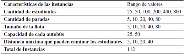 En una reciente revisión del estado del arte en este problema se reconoce que son escasas las instancias de prueba que se usan para comparar las soluciones al problema [10]. Los experimentos que aquí se presentan son realizados sobre un conjunto de 112 instancias generadas en [13], que son las que pudieron obtenerse a partir de solicitudes a los autores. Las instancias van desde las más simples con cinco paradas y 25 estudiantes a las más complejas donde se deben ubicar 800 estudiantes en 80 paradas. Las instancias tienen una flota homogénea que puede ser de ómnibus de capacidad de 25 o 50. Es considerado como parámetro de cada instancia el valor de la distancia que se corresponde al máximo que puede ser recorrido por los estudiantes hasta llegar a la parada.