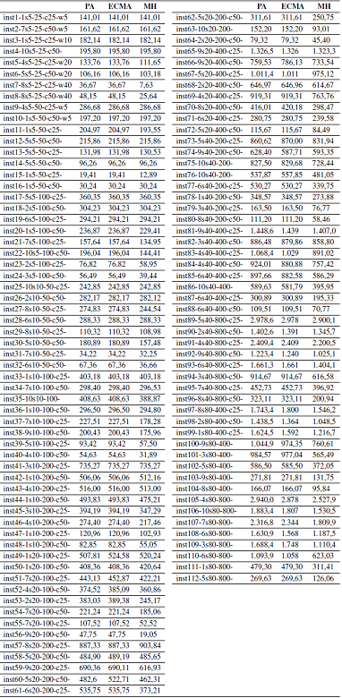 Luego de este análisis se pasó a otra experimentación. En este caso fueron ejecutados los algoritmos que obtuvieron mejores resultados (portafolio de algoritmos y escalador de colinas con mejor ascenso) para cada una de las instancias del conjunto descrito, para ser comparados con el estado de arte en el tema [13]. A continuación, la Tabla III muestra los resultados obtenidos por los algoritmos PA y ECMA. Ambos algoritmos ejecutados con la forma de construcción inicial propuesta en la sección anterior. La tercera columna de la tabla, identificada como MH muestra los resultados obtenidos por [13] con una metaheurística GRASP+VND para las instancias utilizadas.