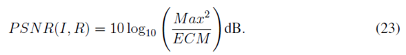 y tiene en cuenta el mayor valor de intensidad que puede tomar la imagen Max. Si se tienen b bits para representar la imagen entonces , y el PSNR se calcula como