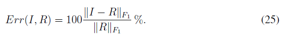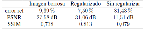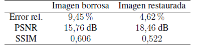 La tabla I muestra la diferencia entre la imagen de referencia (a) y las imágenes borrosas (b) y restaurada (c) respectivamente. Se observa la mejora en calidad, de la imagen restaurada en términos de las medidas PSNR, SSIM y el error relativo. No obstante, no debe esperarse que los errores al final de la restauración sean pequeños, debido a los grandes números de condición que presentan estas matrices; por ejemplo para la restauración de la imagen figura 1 (a), la condición de la matriz A es Cond2(A) = 3,66 x 107.