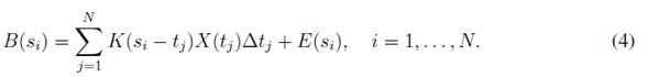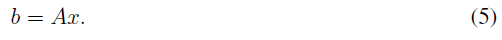 Donde tanto la distancia horizontal como la vertical entre los píxeles es de 1, por lo que Δtj = 1 para cada j = 1,…, N. Ahora bien, si se consideran la matriz A cuyas entradas están dadas por Aij= K(si- tj), los vectores x = (X(t1),…, X(tN))Ty b = (B(s1) - E(s1),…, B(sN) - E(sN))T , la ecuación (4) se convierte en el sistema de ecuaciones: