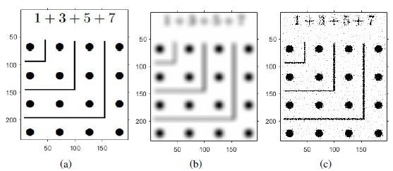 En la figura 1, la imagen (c) muestra el resultado de aplicar el método de restauración de programación lineal a la imagen borrosa (b), la cual se obtuvo mediante la degradación de la imagen (a) de 236x197 píxeles por una PSF exponencial de tamaño 15x15, varianza de 16 y contaminada con un ruido blanco de 0,1%. Se observa que la imagen restaurada (c) es legible a pesar de la presencia de ruido del tipo “sal y pimienta”.