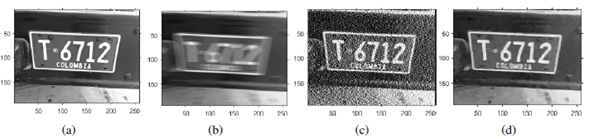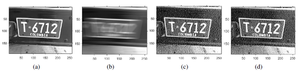 En la figura 3, la imagen (a) es degradada mediante una PSF de movimiento horizontal de tamaño 21x21 y a la imagen borrosa se le añadió 5% de ruido. Se usaron los parámetros de regularización α = 2x10-2 y γ = 8x10-2. Se observa que varias de las zonas que son homogéneas en la imagen original (a) son contaminadas con ruido en la imagen no regularizada (b). Sin embargo, en la imagen regularizada (d) es posible volverlas homogéneas de nuevo. También se observa que no se regularizó demasiado la derivada para no perder ciertos detalles de la imagen (como lo son los tornillos y pernos en la placa y cerca de ella). Por otra parte, hay que tener cuidado de no regularizar demasiado la derivada ya que detalles importantes como lo puede ser la palabra “Colombia” pueden verse afectados.