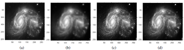 En la imagen figura 4 (d) se observa que al regularizar la norma y su derivada se evita la aparición del ruido artificial que se aprecia en la imagen que no fue regularizada (figura 4 (c)), esto permite recuperar zonas que verdaderamente son homogéneas, al igual que el caso anterior. Sin embargo, dada la naturaleza de la imagen, en la que se presentan varios detalles que pueden ser interpretados como ruido (los puntos blancos que son polvo estelar o estrellas), es necesario regularizar menos la derivada de la solución para no eliminarlos. En este ejemplo, se observa que es indispensable un compromiso entre la cantidad de ruido admisible y la cantidad de detalles permitidos que puedan parecer ruido, esto se refleja en la selección de los parámetros de regularización α y γ.