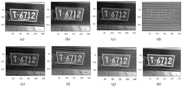 En este experimento se restaura la imagen borrosa 8(b) la cual se obtuvo al aplicar un PSF de desenfoque y un ruido blanco del 1% a la imagen 8(a). Observamos una mejor calidad de reconstrucción al emplear el método propuesto (figura 8(h)). Se recuperan los caracteres degradados evitando, de nuevo, que haya ruido que degrade el fondo. Este efecto es resultado de penalizar la norma kxk1.