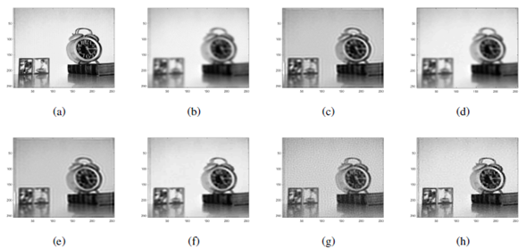 En este experimento se difumina la imagen original figura 6 (a) mediante una PSF exponencial con varianza igual a 7 y luego es contaminada con un ruido blanco del 1%. En la figura 6 se aprecia que las restauraciones de los diferentes métodos apuntan a recuperar los detalles generales de la imagen, aunque en algunas de ellas (figura 6 (d), (e) y (f)) se nota aún la presencia de efectos borrosos sobre esta. En cambio, el método propuesto restaura con mayor nitidez características locales de la imagen, por ejemplo: el portarretratos y los números del reloj (ver figura 6(h)).