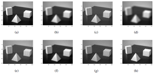 La imagen de la figura 7(b) ha sido generada por la convolución de la imagen original (figura 7(a)), con una PSF de degradado atmosférico y la adición de un ruido blanco del 1%. Se aprecia en la imagen de la figura 7(h) cómo el método propuesto recupera los bordes de las figuras geométricas, evitando que aparezcan líneas de contorno alrededor de ellas o ruido en el fondo de la imagen, a diferencia de lo que se observa en las imágenes 7 (c), (e) y (g). Se nota que el método de Wiener no arroja resultados satisfactorios, esto debido a su sensibilidad con respecto al ruido de fondo.