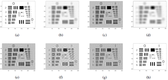 En la figura 4, la imagen (a) de tamaño 255x271 píxeles es degradada con una PSF exponencial con varianza de 16, un coeficiente q = 3 y de tamaño 11x11. Esta imagen fue contaminada con 0,5% de ruido. Se usaron los parámetros de regularización α = 1 x 10-2 y γ = 2,5x10-2.