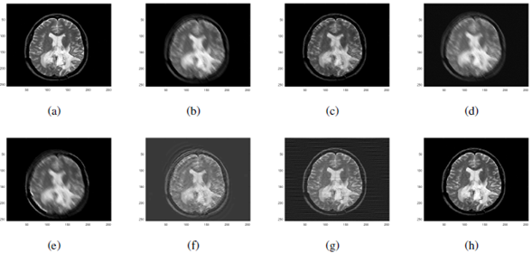 A continuación se presenta una imagen de resonancia magnética (figura 9(a)) que fue alterada mediante una PSF de movimiento en una dirección de 300 grados de tamaño 31x31 y contaminada con ruido blanco del 1%. En la figura 9(h) se aprecia el potencial del método propuesto en el procesamiento de imágenes médicas. Se recupera la imagen manteniendo los detalles de la misma sin añadir ruido al fondo, el cual podría ser nocivo para un posprocesamiento. Además, se restaura la escala de grises con mayor fidelidad que la de las otras técnicas.