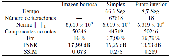 El artículo está organizado como sigue. En la sección 2 se presenta el planteamiento del problema de restauración de imágenes borrosas como un problema de programación lineal y se comparan los métodos Simplex y de punto interior en el proceso de restauración. En la sección 3 se adapta la técnica de regularización como un problema de PL. Los experimentos numéricos se encuentran en la sección 4. Por último, se exponen las conclusiones.