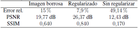 En las tablas III y IV se compara la calidad de las imágenes restauradas obtenidas de solucionar el problema de PL (11) y el problema de PL regularizado (21). Como podemos ver, aplicar la técnica regularización propuesta da un mejor resultado de restauración en las tres métricas.