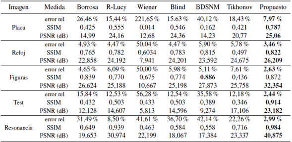 Una evaluación más objetiva de nuestro método se ilustra en la tabla V. En esta se presentan las medidas de error relativo, PSNR y SSIM de las imágenes restauradas por los diferentes métodos y los tipos de difuminado. Los mejores resultados están en negrita. Se puede observar que los valores de error relativo, PSNR y SSIM del método propuesto son superiores a los de otros métodos, excepto en el caso de la restauración de las figuras geométricas (figura 7) en el que el método de deconvolución ciega BDSNM muestra un mejor valor de SSIM. Esto se debe a que la eliminación de ruido de fondo es mejor que la producida por el método propuesto (véase figura 7(f)). Por otra parte, es de recalcar que el método de PL con regularización contrarresta el efecto amplificador de los errores por el mal condicionamiento del problema de restauración. Obsérvese el error relativo de la última columna de la tabla V.