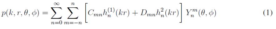 and h (2) n is the spherical Hankel function of the second kind and order n, which represents the incoming spherical waves. Cmn and Dmn are coefficients weighting each term of the spherical wave expansion. k = ω/c is the wavenumber corresponding to the ratio of the angular frequency ω with respect to the propagating speed of sound c. Y m n are the spherical harmonics, defined as