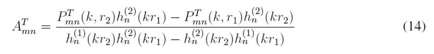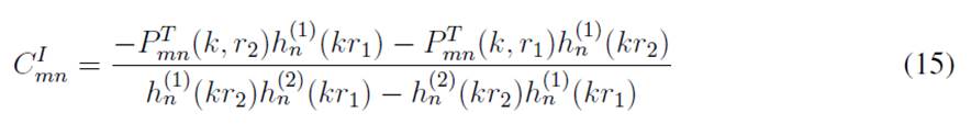 by combining Eqs. (7), (8), and (9). The coefficients for the outgoing waves of the total acoustic field are AT mn = AO mn + AI mn. Recalling that AI mn = C I mn in order to guarantee a finite sound field at r = 0, then AOmn = AT mn − C I mn. Solving for AT mn and Cmn from Eqs. (12) and (13) yields