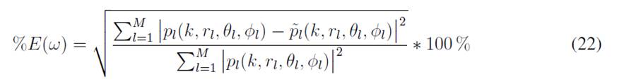 The error norm used for the evaluation of the performance of the SFS method is the total mean square difference between the theoretical radiated field at each sampling point pl(k, rl , θl , φl) and the reconstructed values p˜l(k, rl , θl , φl), defined as