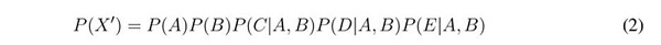 The chain rule reflects the properties of a BN. Let X' = {A, B, C, D, E} be the universe of variables that describe a problem. If GBN defines a Bayesian network over X' (Fig. 3), then Eq. (2) represents the conditional probability of GBN, where A and B are parent nodes and C, D, and E are children nodes. Eq. (2) can be rewritten in the compact form of Eq. (3). Although a GBN is sufficient for updating probabilities, BNs with many nodes have a high computational cost. Some efficient algorithms such as junction three and stochastic simulation considerably reduce this cost.