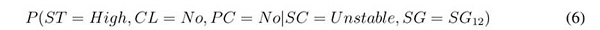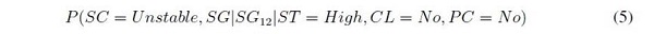 Once the competing hypotheses are defined, a set of probability queries are constructed using the available evidence. Two types of probability queries are identifiable depending on their structure: predictive and abductive. Predictive queries ask about the probability of observing the available evidence, provided that a hypothesis is met. For instance, Eq. (5) represents the probability of observing an unstable condition with the slip geometry SGi2, provided that hypothesis H1 is met.