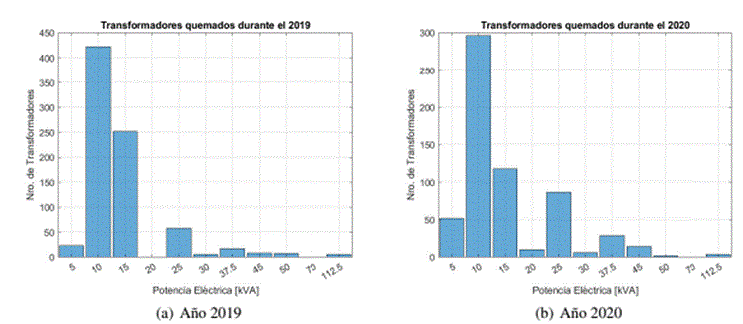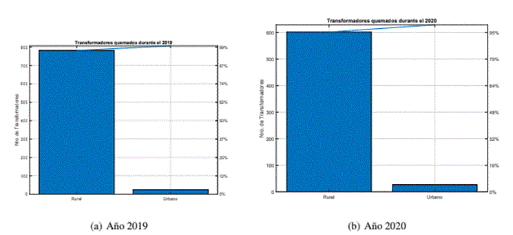 Los resultados evidencian la falta de mantenimiento preventivo de los transformadores en la parte rural, cabe destacar que son los más alejados de la zona urbana de los municipios, además de tener asociados factores de riesgo de corto circuito por baja tensión. Los transformadores que más sufren daño son los de baja potencia nominal (menores a 20 (kVA)), como se evidencia en las Figs. 4(a) y 4(b).