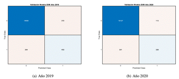 A partir del conjunto de datos de entrenamiento y prueba de los años 2019 y 2020 se construyeron dos modelos SVM de clasificación binaria, los resultados se resumen en la tabla III.