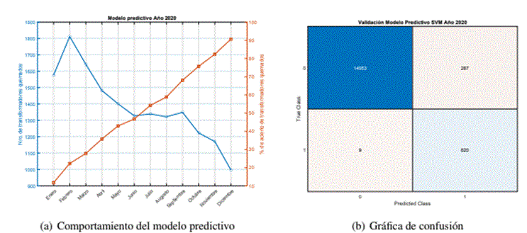 A partir del conjunto de datos de entrenamiento y prueba de los años 2019 y 2020 se construyeron dos modelos SVM de clasificación binaria. El conjunto de datos del modelo SVM correspondiente al año 2019 fue conformado con 2.417 datos para el entrenamiento (que contienen todos los transformadores quemados y parte de los que están en buen estado) y los 13.452 restantes para la validación, de igual forma para el año 2020. Estos modelos se validan con las respuestas reales de cada año, pero aún no son modelos predictivos para realizar el plan de mantenimiento de años futuros, para ello deben construirse modelos predictivos.