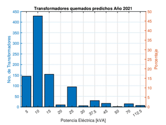 La predicción para el año 2021 arrojó 910 transformadores de los cuales 870 se encuentran en zona rural del Cauca, lo cual concuerda con las tendencias de falla en los años anteriores. En la figura 7 se presenta la distribución de las capacidades nominales para 10s transformadores predichos, en donde se evidencia que los transformadores de 10 k VA continúan siendo prioridad en riesgo. Por el contrario, para esta predicción el algoritmo no le dio prioridad a los transformadores que según el estudio de nivel ceráunico presentan alto riesgo de quema, ya que solo 217 transformadores (23,8%) pertenecen a él. La mayoría de los transformadores alimenta al sector residencial (98,9%), siendo sus clientes los más vulnerables y afectados en su calidad de vida y bienestar.