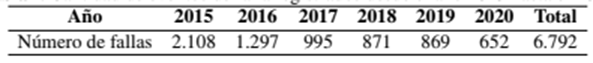 4. Identificación de los eventos de falla en el periodo de estudio: se realiza un recopilación de información exhaustiva desde el año 2015 hasta el 2020, detectando 6.792 eventos de falla. Su distribución en tiempo se presenta en la tabla I.