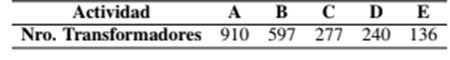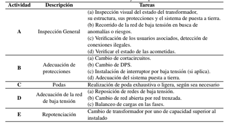 en la zona rural, tengan red aérea, no sea red anti-fraude y su extensión sea considerable. La actividad D será asignada a transformadores con historial de quema reiterativa y red aérea que no sea anti-fraude. Finalmente la actividad E será asignada a todos aquellos transformadores