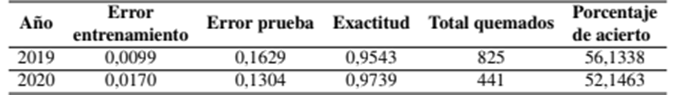 La explicación de la tabla para el año 2019 es la siguiente: la exactitud de los aciertos para la clasificación (en buen estado y quemados) de los transformadores es del 95.43 %. para un total de 825 transformadores quemados (variable de salida), el modelo predice un acierto del 56.13 % para esta variable de interés.