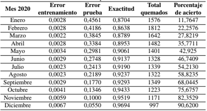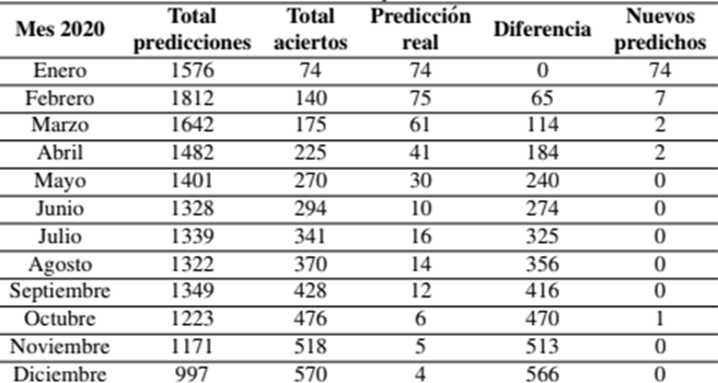 Analizando las predicciones para el año 2020 mes a mes y comparando con los hechos reales, se obtiene la tabla VII, en ella se evidencia que el potencial predictivo del algoritmo es más alto iniciando el ciclo de evaluación (año) ya que, a medida que los eventos de falla empiezan a ocurrir, este tiende a clasificar en mayor medida, reconociendo los equipos que ya se han quemado.