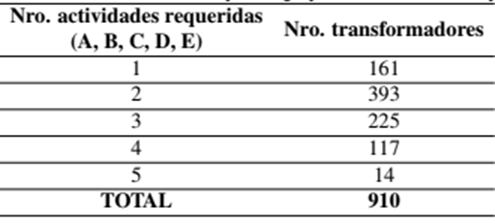 Aplicando la formulación de la programación del plan de mantenimiento de la sección anterior a los 910 transformadores predichos por el algoritmo SVM como más probables para falla por quema en el 2021, en la tabla V se presenta la cantidad total sugerida de cada actividad, se debe tener en cuenta que hay transformadores a los que se les sugiere más de una actividad a la vez, (13 . La actividad A es la inspección general, por lo cual se aplica a la totalidad del conjunto.