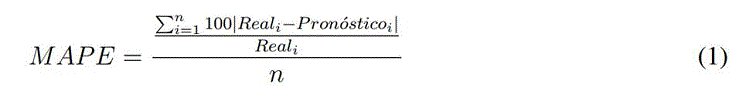 Evaluación del desempeño del modelo: para comparar el desempeño de los modelos se usa la métrica de Error Porcentual Medio Absoluto (MAPE), la cual entrega la desviación en términos porcentuales y no en unidades como las otras medidas. Esta se interpreta como el promedio del error absoluto o diferencia entre el valor real y el pronóstico, expresado como un porcentaje de los valores reales. En la ecuación 1 se muestra la expresión matemática correspondiente.