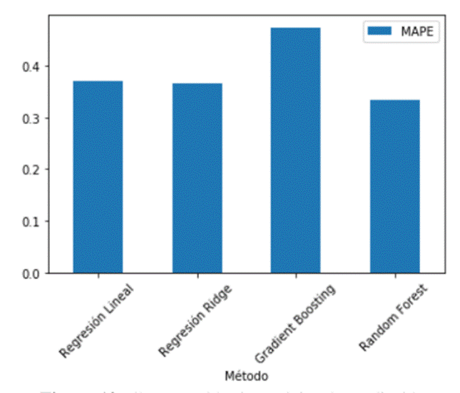 Los resultados sobre la métrica definida obtenida por los modelos, luego del entrenamiento y ajuste de híperparámetros, se muestran en la gráfica de barras de la figura 10.