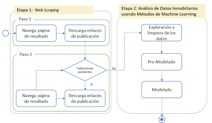 La propuesta metodológica, como se observa en la figura 2, se realiza en dos etapas organizadas de la siguiente forma: (i) Web Scraping: y (ii) análisis de datos inmobiliarios, usando métodos de Machine Learning. Para el desarrollo del componente de software de la primera etapa se sigue el modelo iterativo e incremental denominado Proceso Racional Unificado (RUP, Rational Unified Process por sus siglas en inglés) 16, caracterizado por la realización en paralelo de todas las etapas necesarias para la elaboración del software. Para la segunda etapa, donde se realiza el análisis de datos inmobiliarios se usan métodos de Machine Learning en el marco de la metodología CRISP-DM (por sus siglas en inglés, Cross-Industry Standard Process for Data Mining), la cual esempleada para llevar a cabo proyectos de minería de datos 17.
