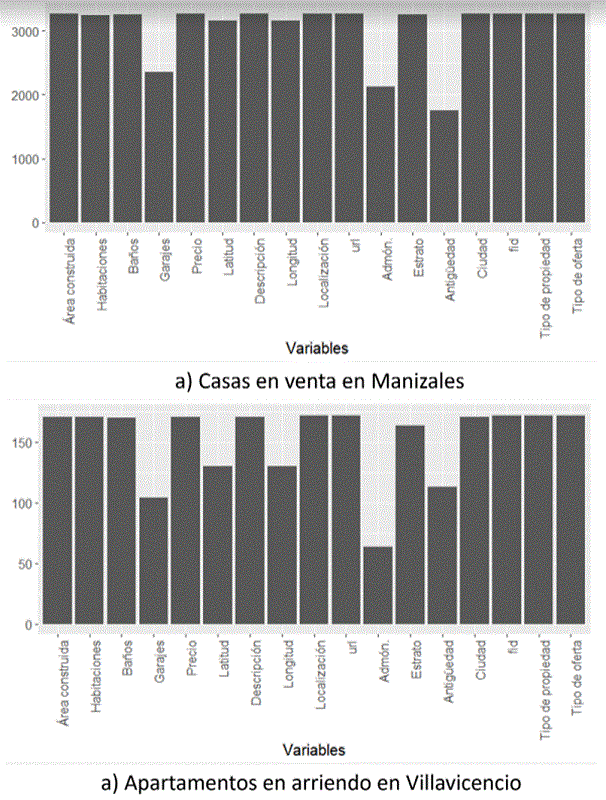 Exploración de variables: se logró para cada área de estudio hacer la identificación de los datos faltantes, encontrando que las variables con mayor ausencia de datos en las publicaciones son: administración, garajes, antigüedad y las variables de carácter espacial longitud y latitud. Se observan en la figura 3 las gráficas de análisis de la completitud de variables para las ciudades de Manizales y Villavicencio.
