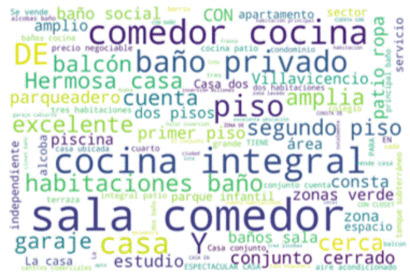 Exploración de variables de texto, donde se revisa particularmente el campo de descripción del inmueble, el cual al ser un texto libre alimentado por el usuario puede arrojar información sobre aquellas palabras claves que con mayor frecuencia se usan para definir la oferta.