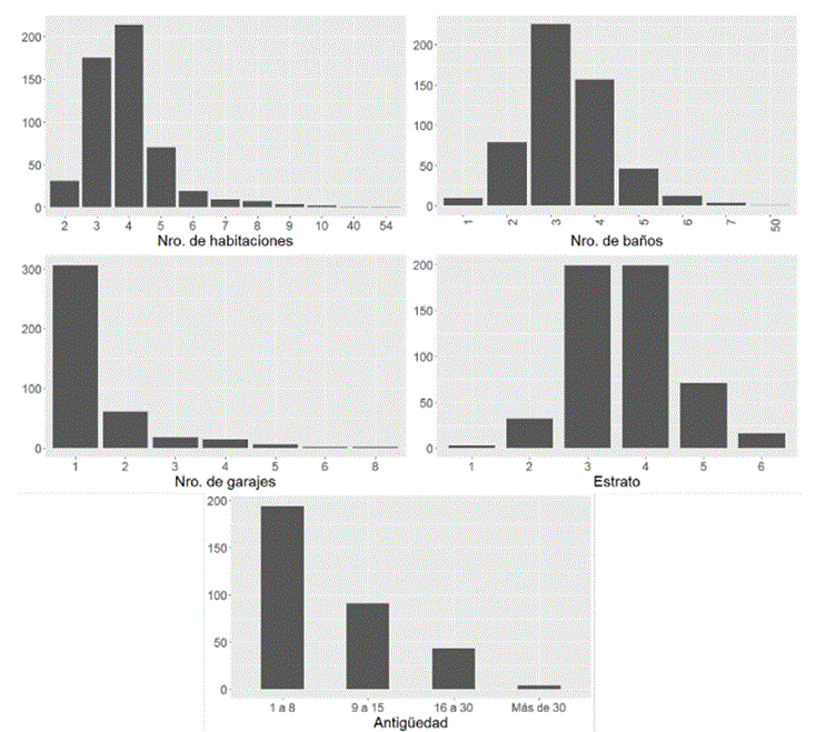 Con relación al análisis de variables discretas, se generaron gráficos de frecuencias asociados a los valores de cada variable que se disponen en la figura 5, con el fin de caracterizar el comportamiento de características de las viviendas en oferta para las ciudades de estudio. De este análisis se identificaron los siguientes aspectos sobre la dinámica inmobiliaria, que contribuyen con la definición de variables explicativas de los valores de oferta, así: en general, para las tres ciudades, la mayoría de las casas en venta poseen entre 3 y 4 habitaciones, en contraste con la venta de apartamentos que tienden a presentar 3 habitaciones, seguido en frecuencia de la oferta de 2 habitaciones para el mismo tipo de bien; en cuanto al número de baños, las casas en arriendo poseen un comportamiento muy similar para todas las ciudades, siendo las casas con 2 baños las de mayor frecuencia, seguidas de casas con I y 3 baños respectivamente; en cuanto al número de estacionamientos o garajes, en general tanto para casas como para apartamentos y sin importar la modalidad de oferta en la que se encuentren (venta o arriendo), presentan un comportamiento similar, siendo aquellos inmuebles de un garaje los más frecuentes de encontrar; con respecto a la distribución de los estratos, el acceso al bien inmueble propio (casa o apartamento) se encuentra en mayor medida concentrada en viviendas con características de estrato 3 o más, principalmente para las ciudades de Manizales y Fusagasugá: por otra parte, considerando la antigüedad del inmueble, en Fusagasugá la venta de casas tiene una mayor frecuencia en aquellas de entre 1 a 8 años, seguidas de entre 9 a 15 y 16 a 30 respectivamente.