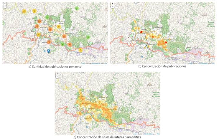 Mapa de concentración de publicaciones: que facilita la identificación de los sitios de la ciudad donde se presenta la mayor densidad de publicaciones.