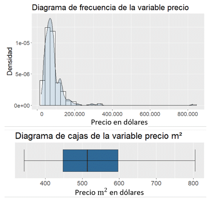Exploración de variables explicativas vs variable objetivo: producto de la exploración de variables para casas en venta de la ciudad de Fusagasugá se obtuvieron los resultados resumidos en la figuras 7 y 8. Primero se realizó la exploración de la distribución de las variables objetivo como se observa en la figura 7, a partir de las cuales se resalta que: