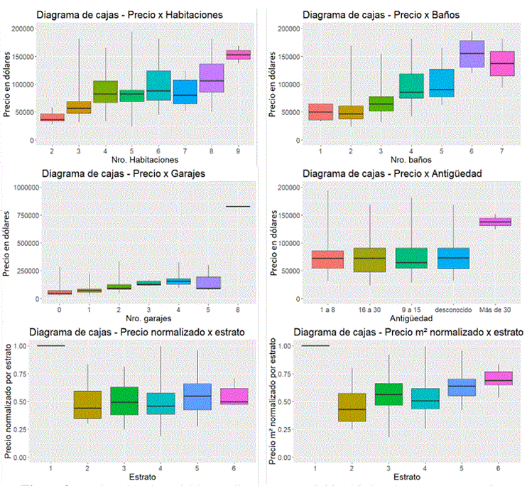 Exploración variables explicativas vs variable objetivo: este proceso tiene como propósito contrastar diferentes variables del conjunto de datos como variables explicativas con respecto al valor del inmueble. Se hace uso de histogramas y diagramas de caja para abordar la exploración estadística de las variables, que faciliten la identificación de relaciones entre el precio de los bienes inmuebles y algunas características como: número de garajes, número de habitaciones, número de baños, años de antigüedad y estrato.